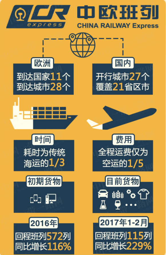 目前,中欧班列已经初步形成西、中、东3条铁路运输通道,涵盖运行线路51条。截至2017年5月,国内开行城市增加到28个,到达欧洲11个国家29个城市。中欧班列开行数量也实现了爆发式增长。2017年一季度中欧班列开行593列,同比增长175%;回程班列198列,同比增长187%。2017年全年计划开行2200列,将创下历史新高。