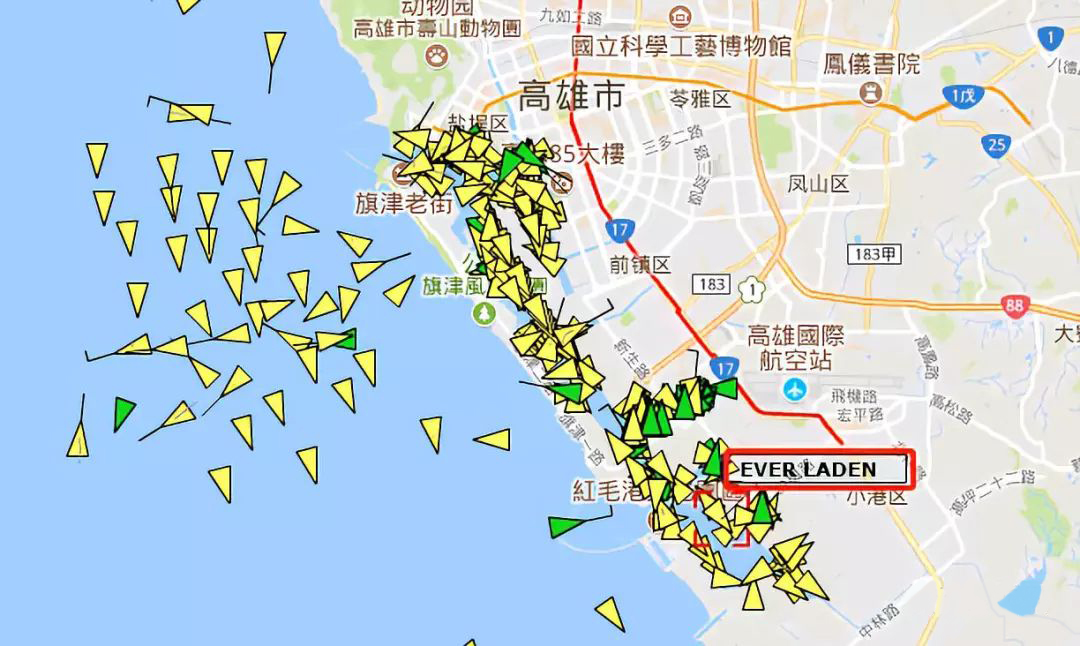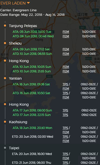 船公司船期资料显示,Ever Laden 轮曾分别于6月16日挂靠盐田港、6月17日挂靠香港,并在6月19日靠泊高雄港!